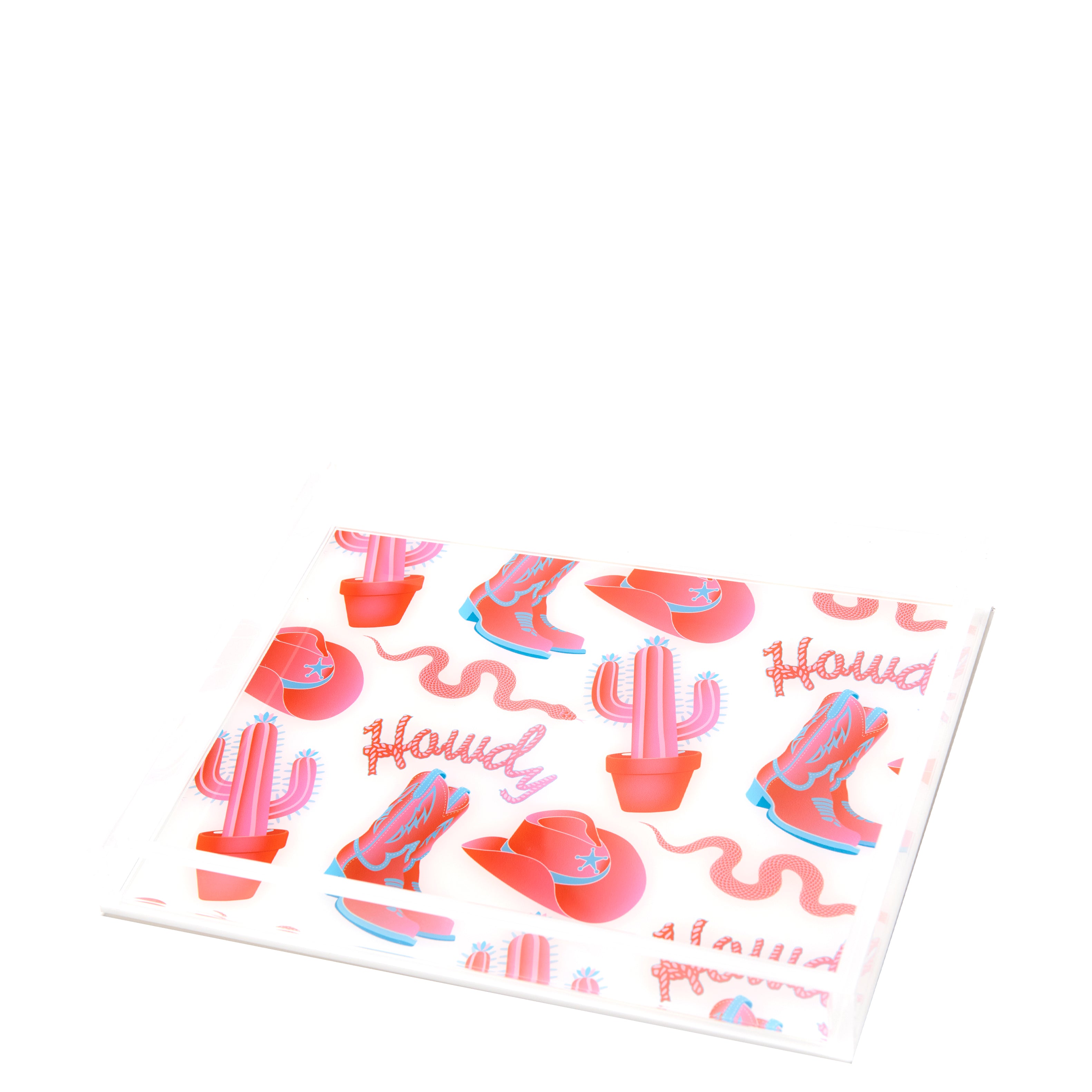 This small acrylic tray, adorned with a pink cowgirl boot, hat, and snake, brings a bold Western vibe to any table or bar. Perfect for serving cocktails, corralling keys, or adding a little yeehaw to your décor.